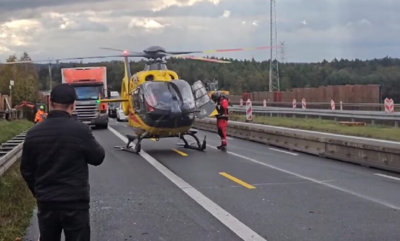 Droga jest całkowicie zablokowana. Na miejscu ląduje śmigłowiec Lotniczego Pogotowia Ratunkowego. Na miejscu pracują służby ratunkowe.