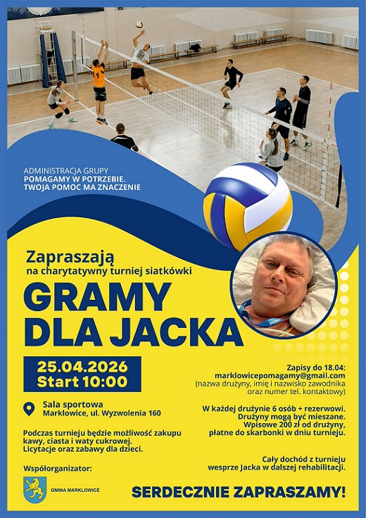 25 kwietnia 2026 roku o godzinie 10:00 w sali sportowej w Marklowicach przy ul. Wyzwolenia 160. To będzie dzień, w którym lokalna społeczność pokaże, jak wielką ma siłę, gdy trzeba pomóc drugiemu człowiekowi. Cały dochód z wydarzenia zostanie przeznaczony na dalszą rehabilitację Jacka Morgały. Każda złotówka, każda obecność na hali, każde wsparcie będzie miało realne znaczenie.